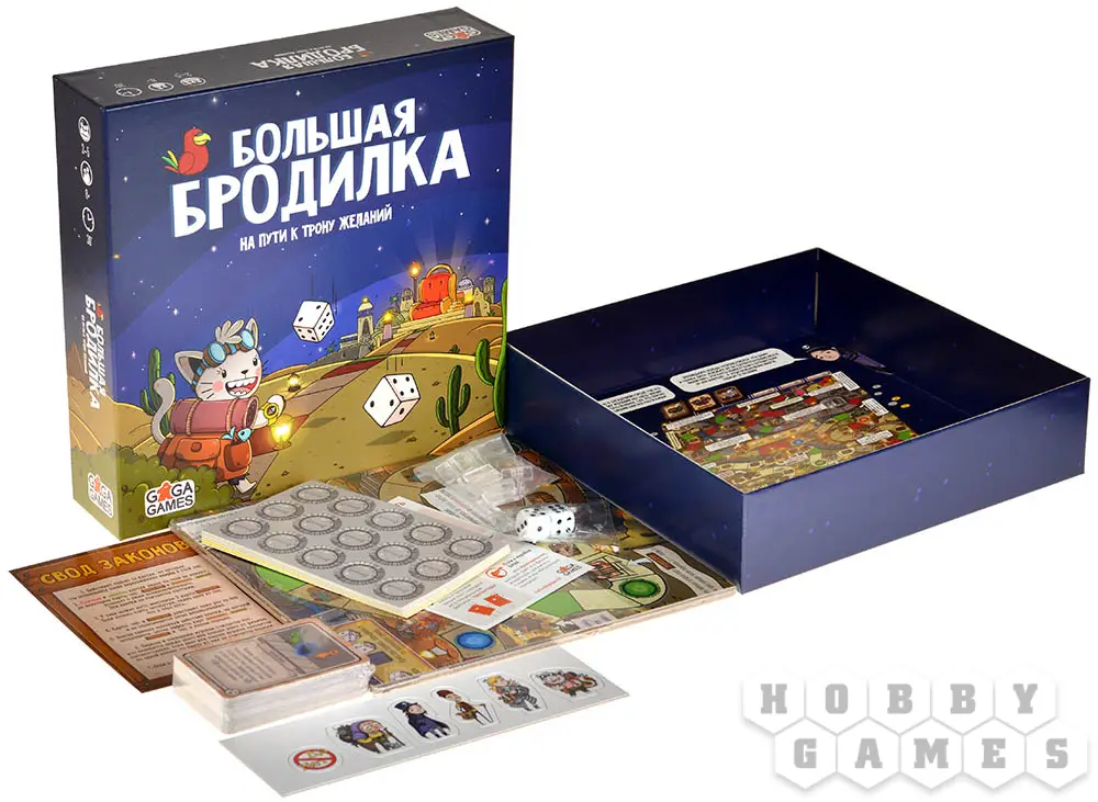 "На пути к трону желаний" – это новая самостоятельная часть знакомой многим настольной гонки "Большая бродилка"! Если вам наскучило вести своего персонажа одной и той же дорогой, а карточки из лавки Джо больше не удивляют, то эта коробка станет вашим спасением! Во-первых, в игре новая карта. Извилистый маршрут со своими ловушками и хитростями не даст вам заскучать. Во-вторых, в комплекте целая куча новых карт: сундуки, "Та-Дам" и "Лавка Джо" удивят и вас, и ваших оппонентов. И, в-третьих, у каждого героя теперь есть свои уникальные способности! Но самое главное, что при всех нововведениях игровой процесс остался всё таким же простым и весёлым! Отправьтесь в новое захватывающее приключение со своими друзьями!
