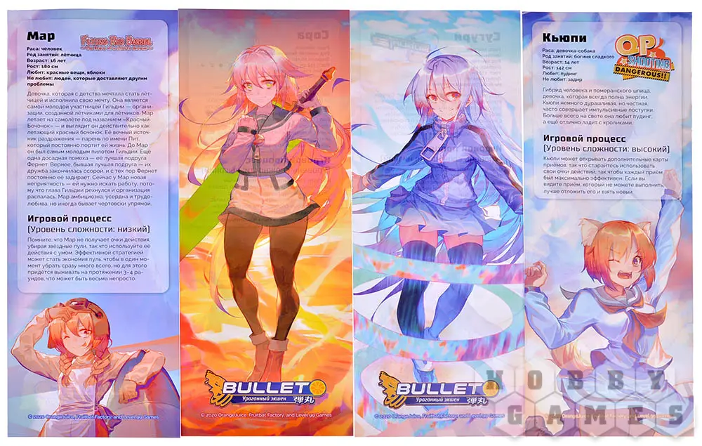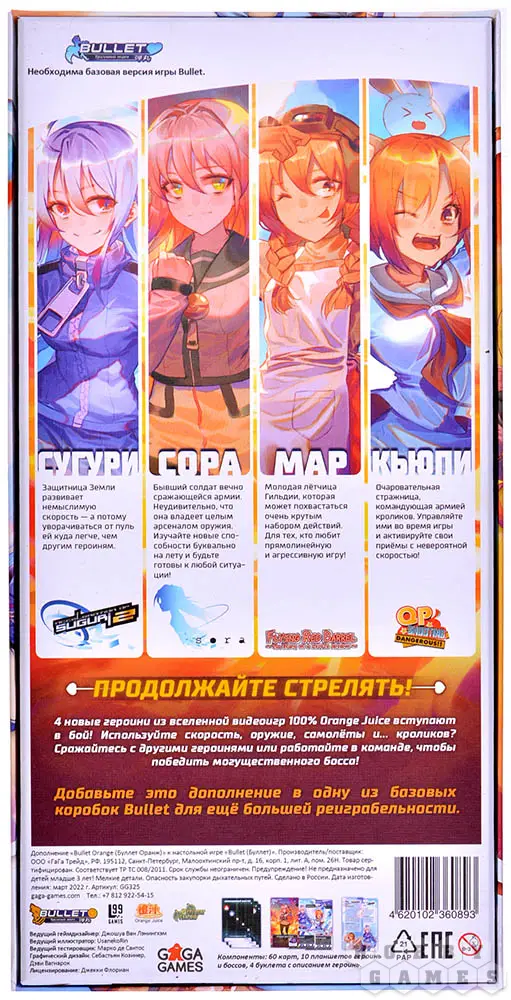 "Bullet: Orange" добавляет к базовой версии игры ещё четырёх героинь, которые были перенесены из видеоигры 100% Orange Juice. Механически ничего не поменялось: это всё та же безумная игра в стиле компьютерных шутеров и аниме. Но вот разнообразия прибавилось! Новые героини готовы ворваться в самый эпицентр чумовой перестрелке и показать приевшимся участникам новые навыки!