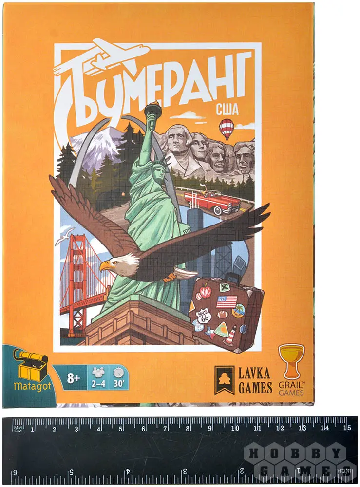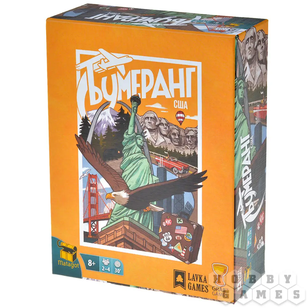 В настольной игре "Бумеранг: США" вам предстоит отправиться в Америку! Посетите каждый штат, полюбуйтесь местными достопримечательностями, посетите различные мероприятия и запечатлейте свои приключения!