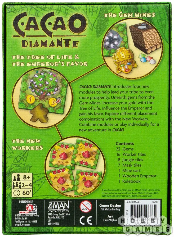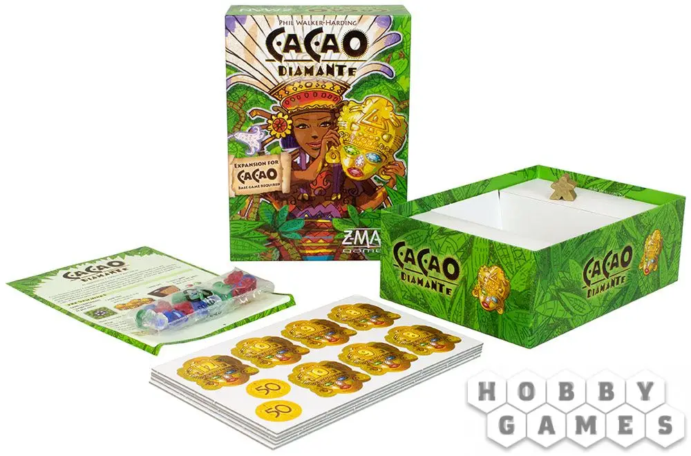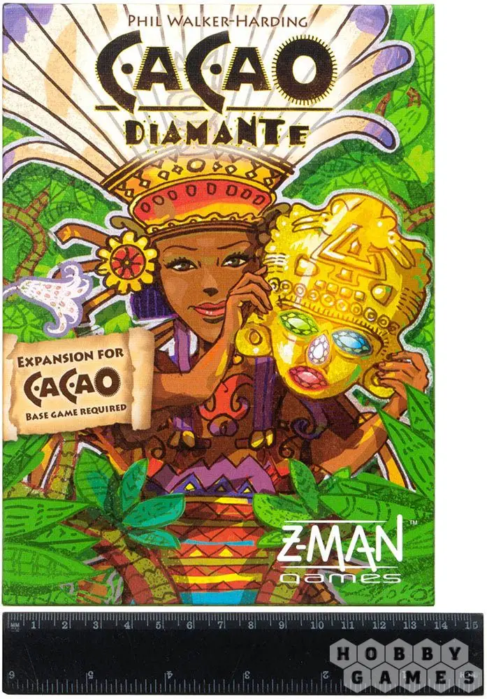 Cacao: Diamante – дополнение для игры Cacao, в котором игроков ждут четыре модуля, дающих ещё больше вариантов игрового процесса, соответственно у вас теперь будет больше способов привести собственное племя к процветанию. Отправляйте ваших рабочих в дебри джунглей, на рудники, где происходит добыча редких драгоценных камней и последующая их транспортировка на объёмной тележке. Собрав камушки всех четырёх цветов, можно будет обменять их на красивую древнюю золотую маску. Откройте для себя Древо Жизни в джунглях и увеличивайте ваши золотые запасы. Впоследствии вы сможете получить влияние на Императора и добиться его благосклонности.