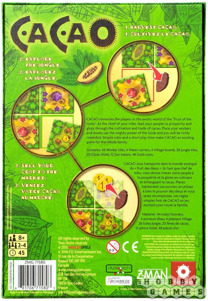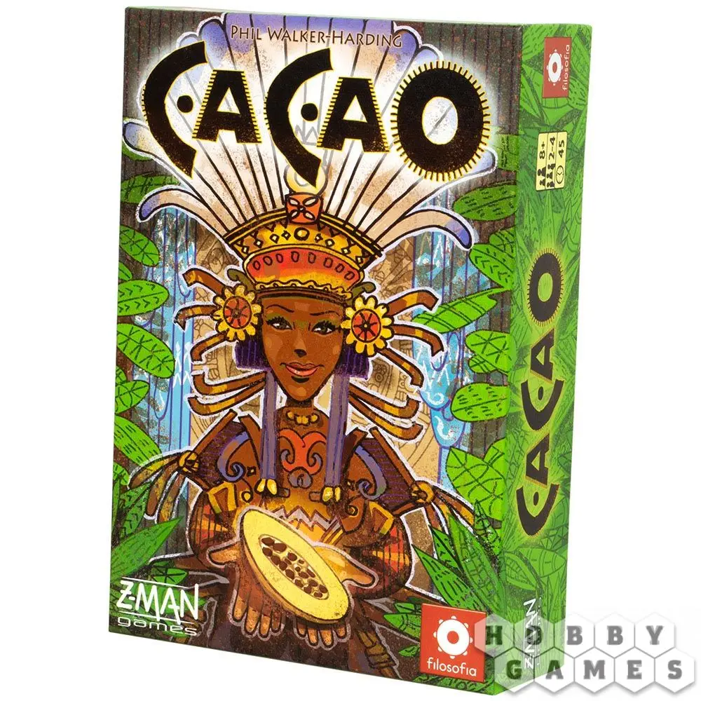 Cacao – настольная игра с механикой размещения тайлов. Игрокам предстоит совершить путешествие в экзотический мир "фрукта богов" и взять под своё управление одно из племён, занимающихся сбором какао. Ведь именно эти плоды приносят очень даже неплохую прибыль! В процессе игры, постепенно развивая плантации, участники заполняют джунгли, занимая наиболее выгодные места.
