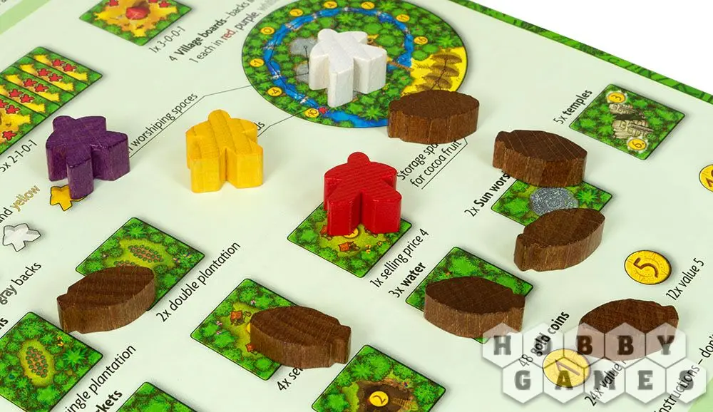 В свой ход игрок выкладывает один из тайлов джунглей, на каждом из которых могут быть как плоды какао или колодцы с водой, так и шахты с золотодобычей, рынки или же храмы для поклонения солнцу. Всё это приносит определённую выгоду игроку.