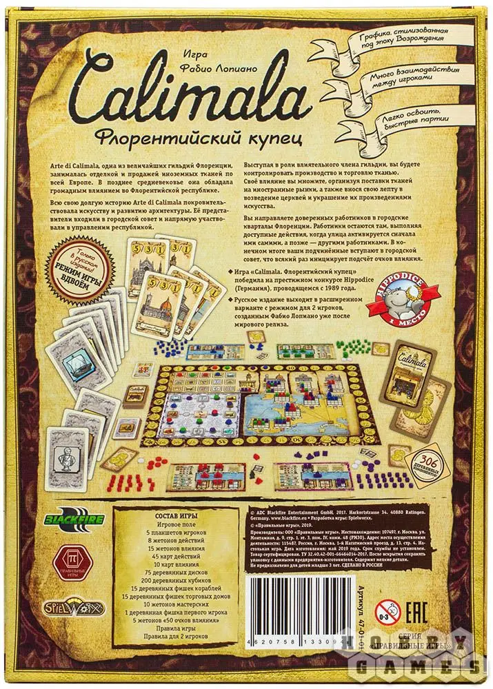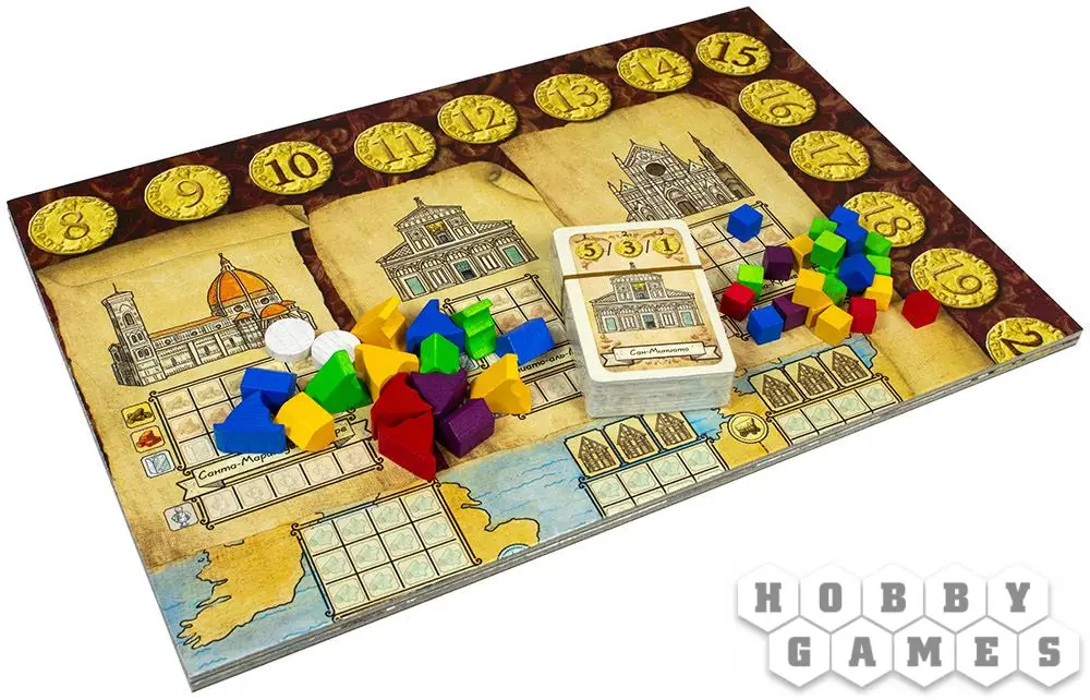Всё это ждёт вас в игре «Calimala. Флорентийский купец»! Вы, как и другие игроки, выступаете в качестве привилегированного члена Arte di Calimala и конкурируете с ними за влияние в гильдии. Вы строите мастерские и производите ткань высочайшего качества, которую затем отправляете морем и по суше в важнейшие города Европы. Вы жертвуете материалы на возведение величественных соборов и украшаете их скульптурами. И, конечно, боретесь за места в городском совете для своих представителей!