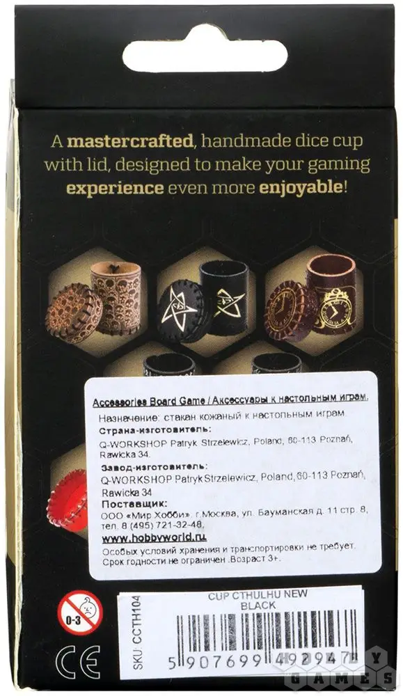 Стильный и практичный стакан для кубиков – именно то, что поможет вам как использовать любимые кубы в игре, так и сохранить их от налёта времени в свободное от игры время. Стаканы для кубов производства Q-Workshop выполнены из высококачественной кожи, и каждый из них отличается уникальным и запоминающимся дизайном. Вы точно найдёте то, что соответствует вашему стилю и игровому вкусу!