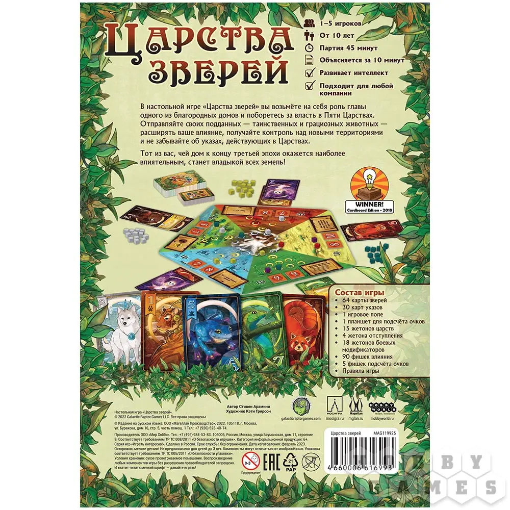 Цель игры – занимать самые выгодные позиции, учитывая различные указы. Участники ходят по очереди до тех пор, пока все игроки не решат отступить – в таком случае эпоха текущая эпоха заканчивается и начинается новая. При помощи карт вы будете взаимодействовать с игровым полем – оно отражает Пять Царств зверей, а также содержит ячейки для жетонов и карт указов, что влияют на процесс игры. В свой ход вы можете выполнить одно из трёх действий: 1. Захватить территорию: сыграйте карту зверя под одним из царств и разместите в нём фишку влияния