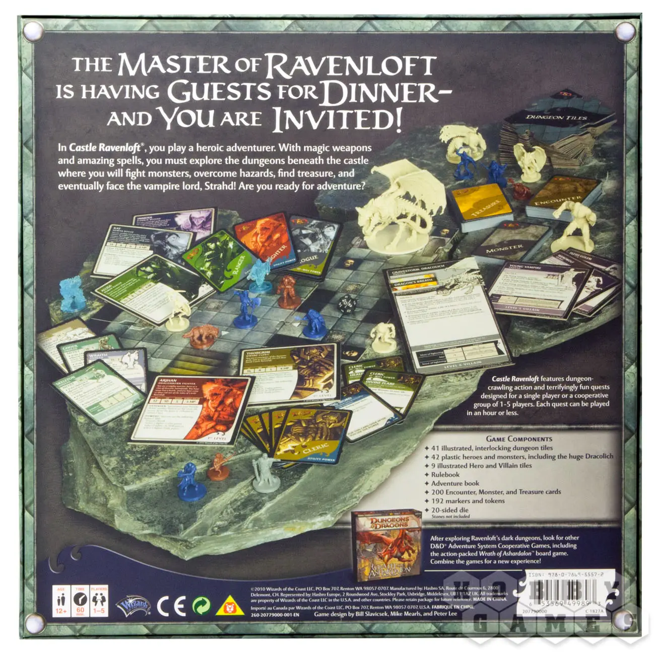 «Castle Ravenloft/ Замок Равенлофт» – это кооперативная игра, в которой Вы и ваши друзья возьмете на себя роль настоящих Героев, и должны будете работать как одна команда, чтобы преодолеть все те страшные приключения, которые поджидают вас в Замке. В этой игре вы можете победить только все вместе… впрочем, и проиграть тоже. Каждый игрок выбирает героя из следующего списка: клирик, воин, разбойник, маг и следопыт. Они исследуют подземелье замка, разгадывают тайны, сражаются с монстрами и находят волшебные сокровища. Игра бросает вам вызов: она будет (с небольшой помощью от вас) расставлять ловушки, запускать различные события, вызывать монстров и злодеев себе на подмогу – уж этого добра в залах Замка хватает. Игра предназначена для 1-5 игроков, она включает в себя несколько сценариев, задания различной сложности и предполагает много взаимодействия между игроками.