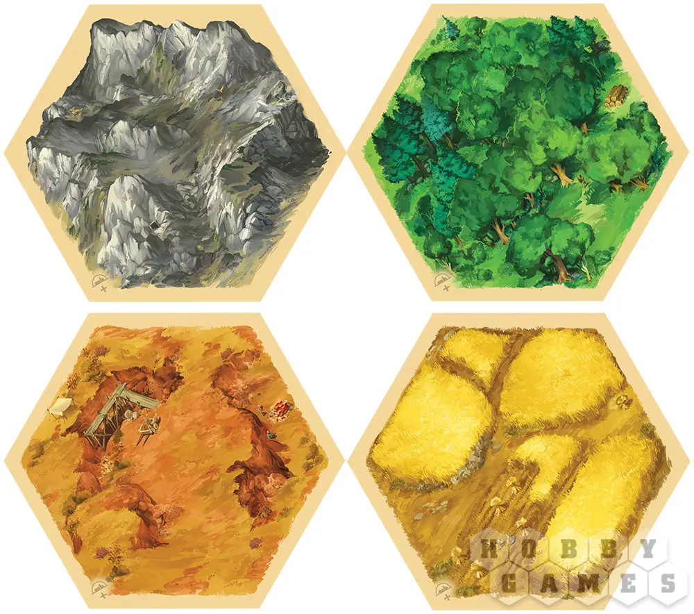 Все игроки, чьи Поселения соприкасаются с таким гексом, получат с него 1 карту соответствующего ресурса