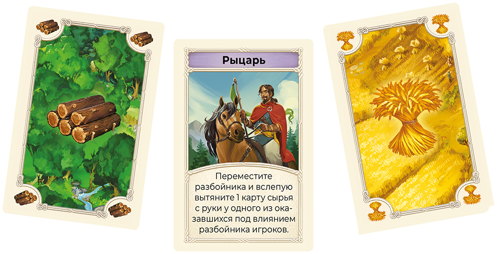 Если на кубиках выпадает 7, то самые зажиточные игроки (более чем с 7 картами) сбрасывают половину ресурсов, а активный игрок может стать Разбойником