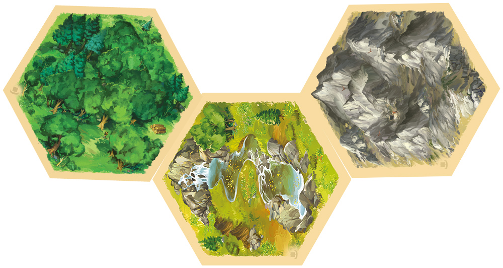 - Все игроки, чьи Поселения соприкасаются с таким гексом, получат с него 1 карту соответствующего ресурса
