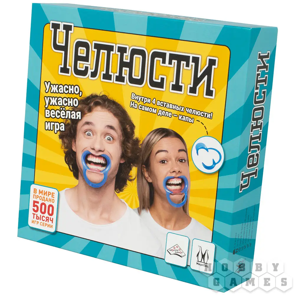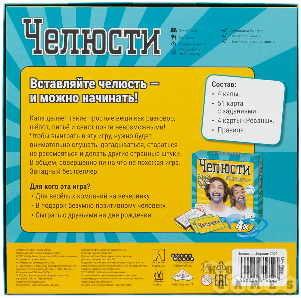 В весёлой настольной игре "Челюсти" вам предстоит выполнять различные задания, например, произнести какую-либо фразу, съесть банан, выпить стакан воды или объяснить словосочетание, но всё усложняется тем, что во рту у игроков размещаются специальные пластиковые капы. И вот здесь и начинается самое интересное, потому что сделать всё это, кажущееся на первый взгляд простым, будет очень и очень непросто! Карты с заданиями отличаются по цвету, который указывает на особенность выполнения заданий, а также на получение победных очков. Также в игре присутствуют карты "Реванш", которые можно использовать в том случае, если в дуэльном "красном" задании не получилось одержать верх. Такая карта даёт возможность повторить испытание.