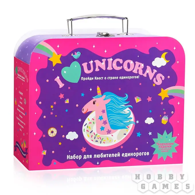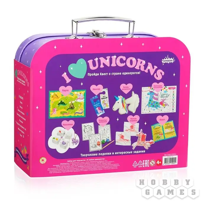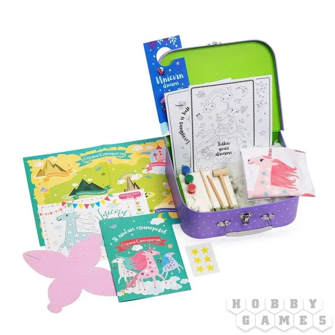 Совершите путешествие в страну единорогов, познакомьтесь с ее сказочными обитателями и выполните их увлекательные задания. В процессе игры дети своими руками сошьют мягкую игрушку, почувствуют себя искателями сокровищ, сделают керамическую брошь и праздничные открытки, а еще поучаствуют во множестве интересных испытаний. Правила игры подробно описаны в красочном буклете.