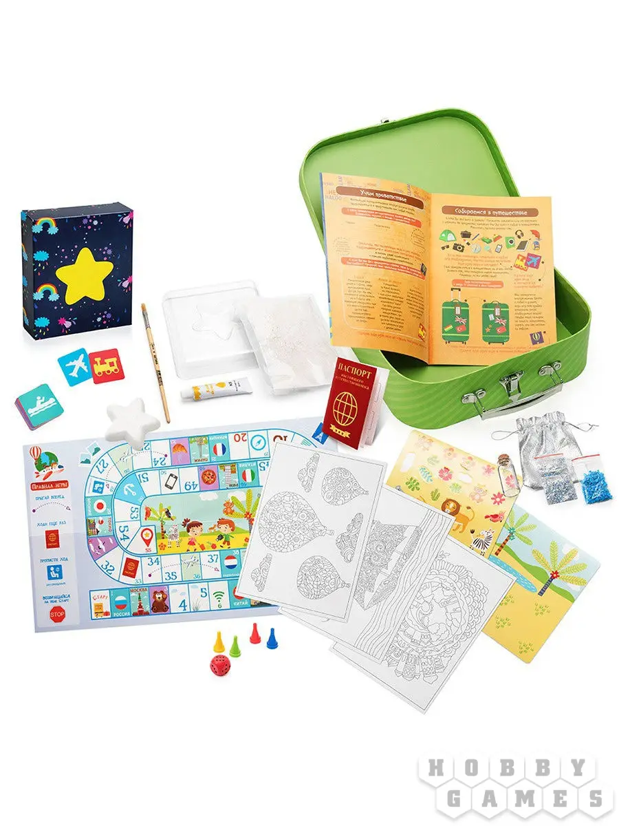 В комплекте: книжка-инструкция с заданиями, паспорт путешественника, игра-ходилка, фишки и кубик для игры, 30 карточек для игры в «Мемо», открытки-раскраски 3 шт., набор для создания поделки «Талисман», набор для создания «Звезды путешественника» из гипса, кисточка, акриловая краска, набор с многоразовыми наклейками, набор наклеек для украшения чемодана
