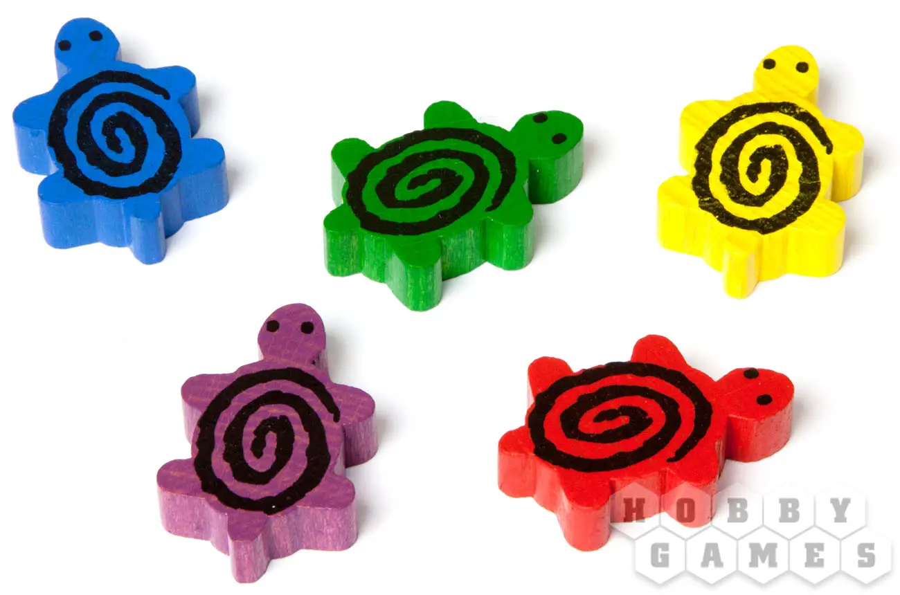 В свой ход Вы можете сыграть одну карту с руки и выполнить предписанное ей действие. Двигать можно только черепаху того же цвета, что и сыгранная карта, даже если это не ваш цвет, а разыгрывать можно карты любой черепашки. Когда черепаха попадает на деление с другой черепахой, она залезает к ней на панцирь, таким образом, на делении может вырасти целая башня из черепах. Передвигаясь, черепаха везёт с собой всех соперниц, которые сидят у неё на спине.