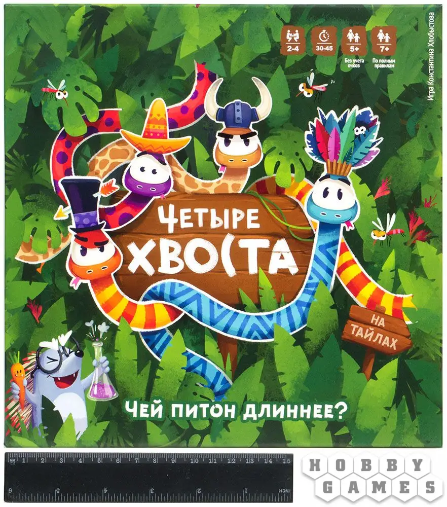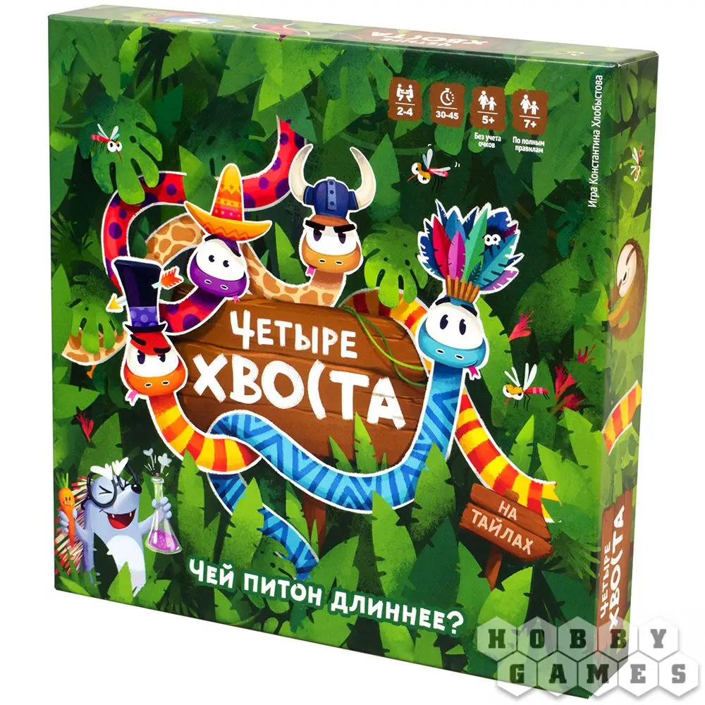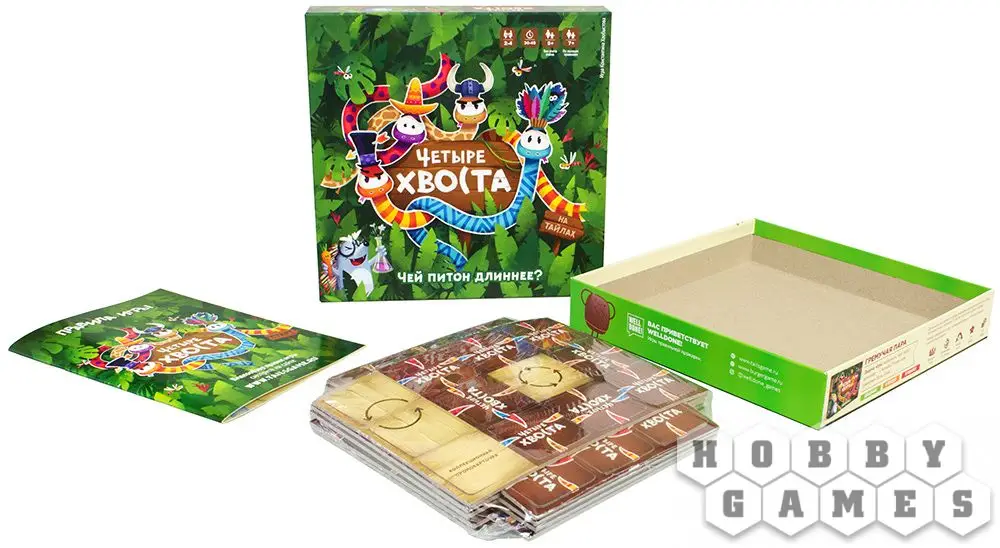 Задиристый Хью, весёлый Хосе, воинственный Жираф и добродушный Лионель – настоящие питоны, которые вылупились из волшебного яйца, найденного кладоискателями в джунглях Амазонки. В весёлой настольной игре "Четыре Хвоста" вам предстоит вырастить этих братьев до максимального размера.