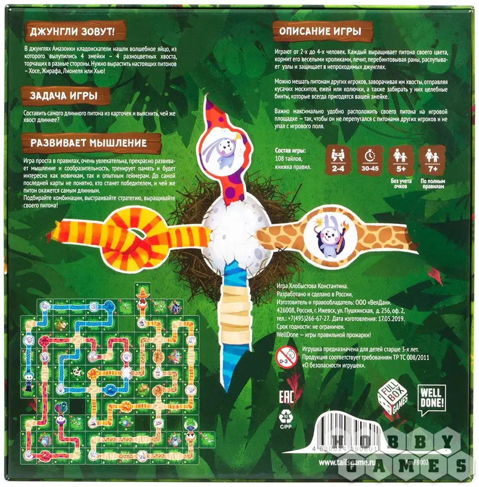 Увеличивать своего питона вы будете с помощью специальных карт, каждая карта добавляет вам победных очков, а особые карты с зайками добавляют их ещё больше. У всех питонов есть друзья – ленивец Майло, хамелеон Пискун, панда Лори и мартышка Том-Том, их можно просто положить рядом и сразу получить много очков, ведь каждому нужен друг.