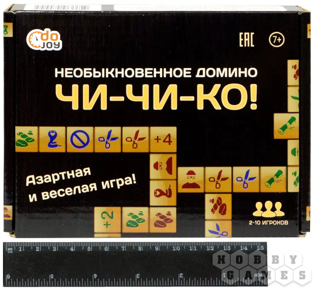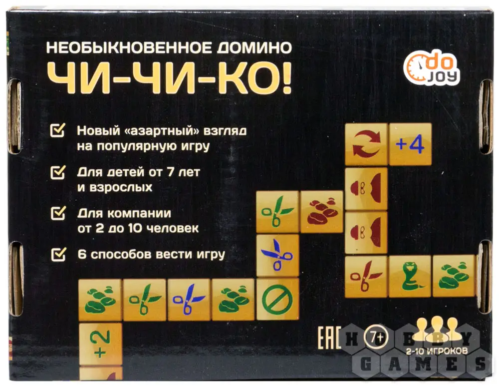 В правилах к «ЧИ-ЧИ-КО!» вы найдете 6 оригинальных способ вести игру, а благодаря большому количеству доминошек играть в настольную игру можно в компании до 10 человек.