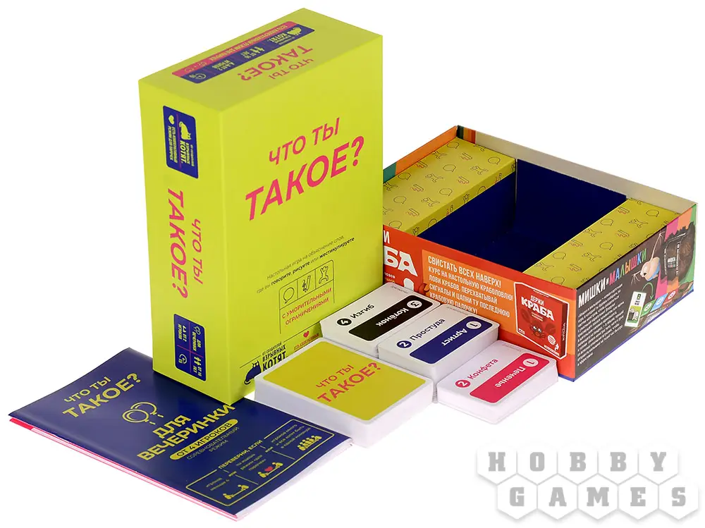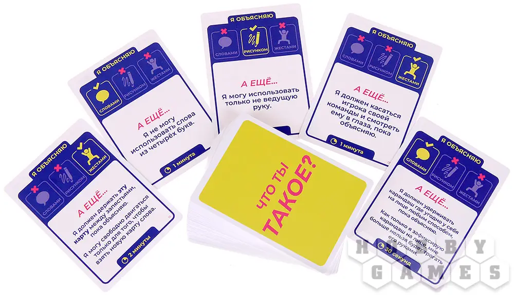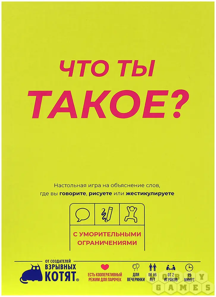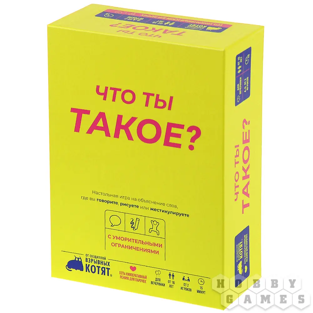 "Что ты такое?" могла стать очередной игрой на объяснение слов разными способами, при взгляде на которую в голове появлялся бы вопрос, украшающий коробку. Но она не стала! А всё благодаря своей изюминке – забавным ограничениям, превращающим игровой процесс в театр абсурда и нескончаемой уморы. Вот представьте: вы вытянули карту задания, а она говорит вам объясняться рисунком, НО В ПРОЦЕССЕ ВАША ГОЛОВА ДОЛЖНА ЛЕЖАТЬ НА СТОЛЕ. Или вы должны объяснить слово жестами, НО В ЭТО ВРЕМЯ ВЫ ОБЯЗАНЫ КРУЖИТЬСЯ ВОКРУГ СЕБЯ ВСЁ ВРЕМЯ. Звучит безумно, не правда ли? А выглядит ещё безумнее и смешнее, отчего в голове и возникает тот самый вопрос: да что же ты такое?
