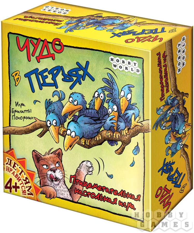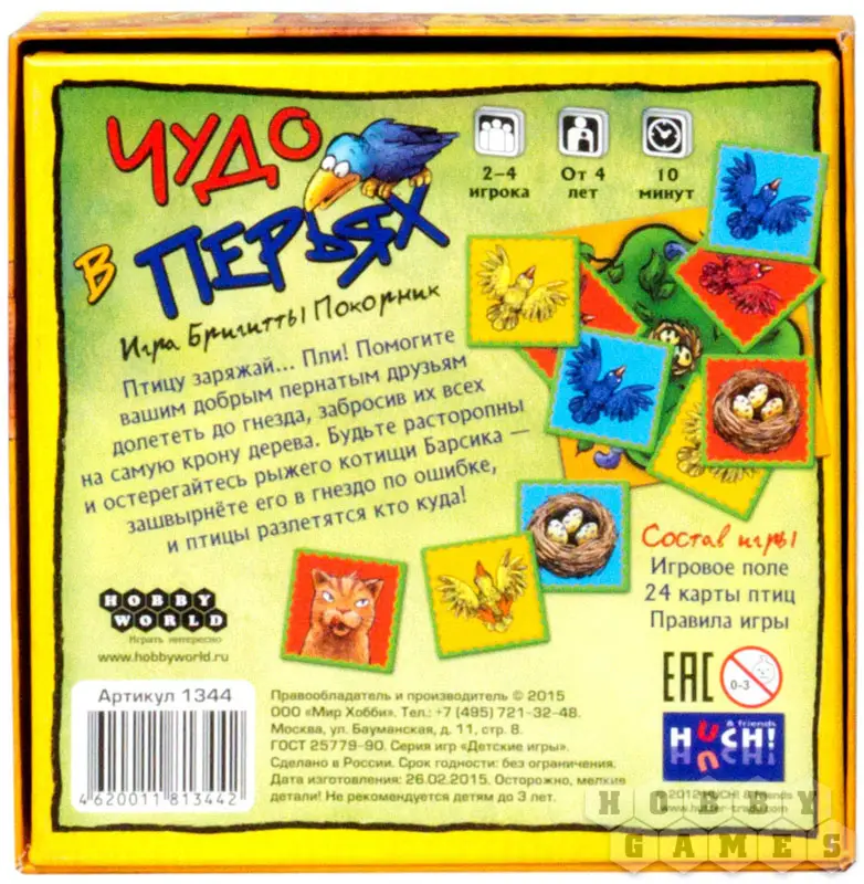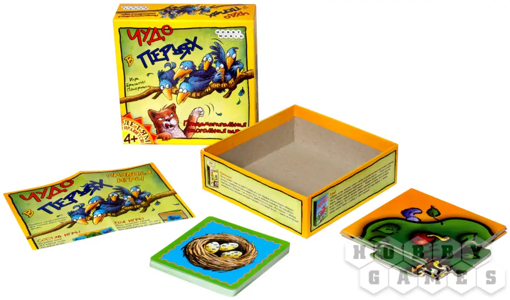 Птицы совсем обленились! «Чудо в перьях» — это озорная детская игра для 2-4 игроков, в которой вам в прямом смысле придётся забрасывать птиц на крону дерева. С помощью этой игры вы определите самого ловкого в вашей дружной компании, а простые правила и занимательный геймплей будет интересен и понятен не только детям от четырёх лет, но и их родителям!