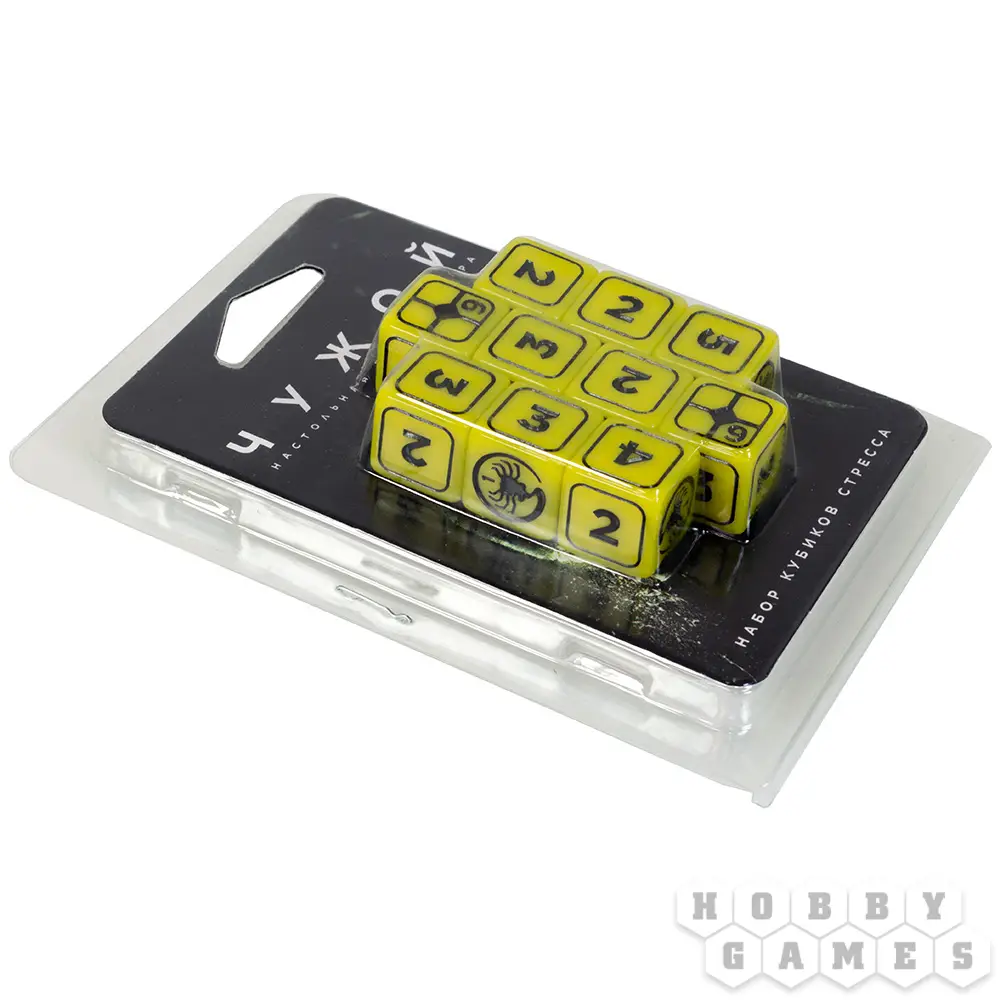 Перед вами набор из десяти жёлтых кубиков стресса, дизайн которых был разработан для настольной ролевой игры "Чужой" и учитывает особенности правил. Данные кубики также можно использовать в любой другой игре как обычные шестигранные кости.