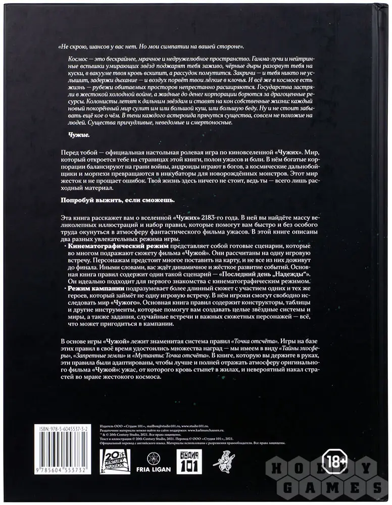 Откройте для себя официальную настольную ролевую игру по культовой вселенной, основанной на фильме "Чужой". Вы можете играть как в режиме кампании, так и в кинематографическом режиме. Для каждого из них существуют свои фрагменты правил, относящиеся только к этому режиму. В кинематографическом сценарии события протекают стремительно, подразумевая выяснение отношений между игроками и неизбежную гибель многих из них. В режиме кампании, в отличие от кинематографического, дело не обойдётся единичной встречей. Создав собственных персонажей, участники будут играть снова и снова, в очередной раз собираясь за столом. В режиме кампании шанс выжить гораздо выше, ведь сюжет рождается благодаря решениям ведущего и самих игроков.