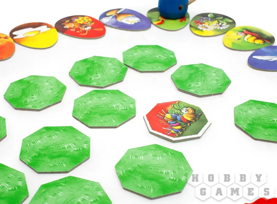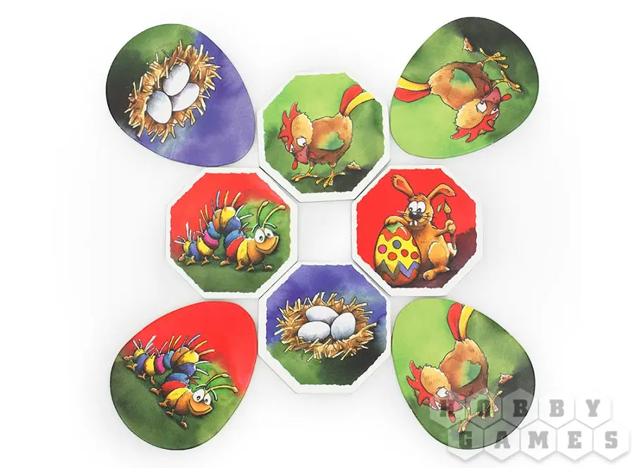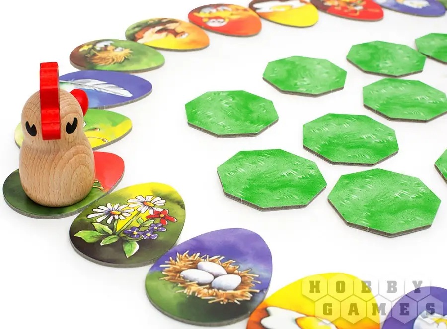 Как же это происходит: беговая дорожка - это 24 карточки в форме яиц. На них нарисованы различные картинки (про картинки отдельный разговор - они ОЧЕНЬ симпатичные). Внутри этого чудо-стадиона располагаются 12 восьмиугольных карточек с точно такими же картинками, но лежат они, как вы уже наверно догадались, картинками вниз. Чтобы сделать шаг по дорожке участнику только и нужно, что вытянуть восьмиугольную карточку с ТАКОЙ ЖЕ картинкой, как та, что находится перед клювом его курицы. Картинки совпали - сделал шаг, берешь следующую карточку и так до первой ошибки!
