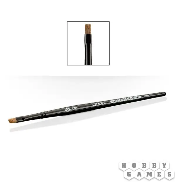 Эта маленькая по размеру кисточка состоит из комбинации синтетических волосинок и волосинок волов, специально, чтобы повышения жёсткости и прочности кисти. Плоский профиль позволит равномерно покрывать поверхности модели на различной высоте — что очень важно при сухой покраске.