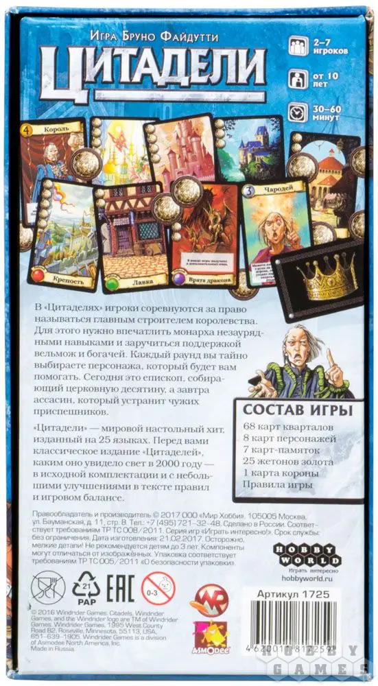 "Цитадели" – мировой настольный хит, изданный на 25 языках. Перед вами классическое издание "Цитаделей", каким оно увидело свет в 2000 году – в исходной комплектации и с небольшими улучшениями в тексте правил и игровом балансе.