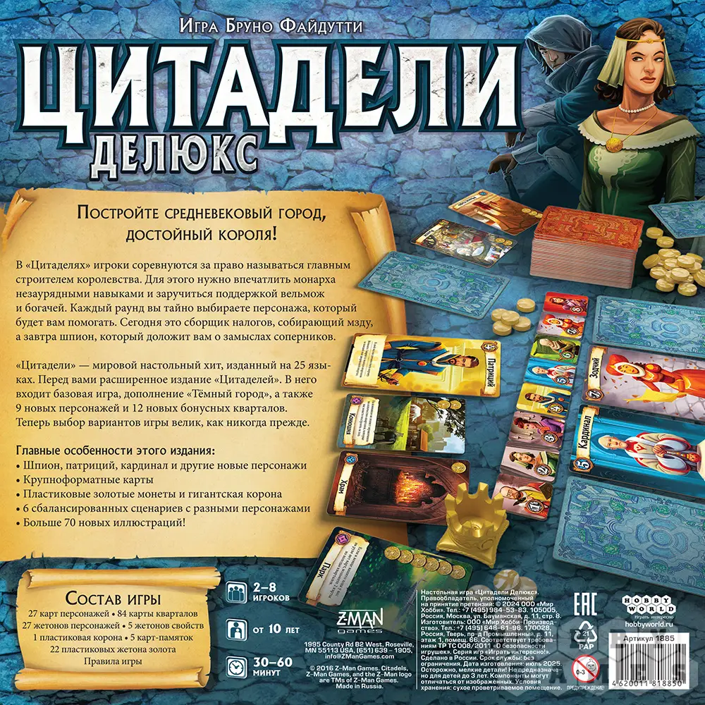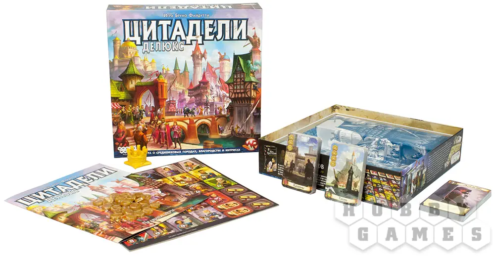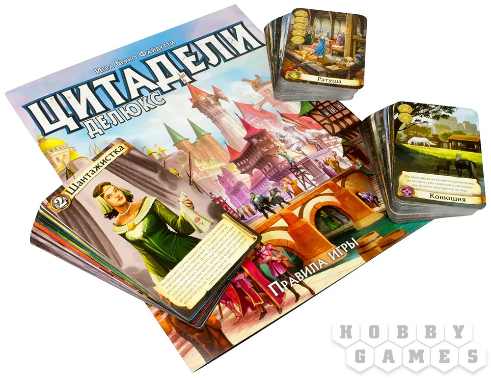 "Цитадели" – это всемирно известная настольная игра Бруно Файдутти, увидевшая свет в далёком 2000 году и переведённая на данный момент уже на 25 языков. В целом, игру можно описать как карточную градостроительную настольную игру, но на самом деле "Цитадели" абсолютно уникальны и сочетают в себе сразу несколько жанров, включая психологическую игру. По ходу партии игроки получают золото, выбирают себе на руку карты кварталов, а затем могут производить застройку, покупая эти самые кварталы за золото. Цель игры – построить самый престижный, то есть самый дорогой город.