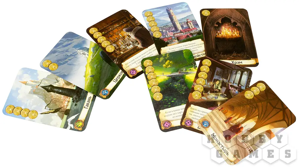Каждый игрок получает по 2 золотые монеты и 4 карты кварталов. Золото тратится на многие цели, но в основном оно нужно для строительства. Чем дороже квартал, тем больше золота понадобится для его строительства.