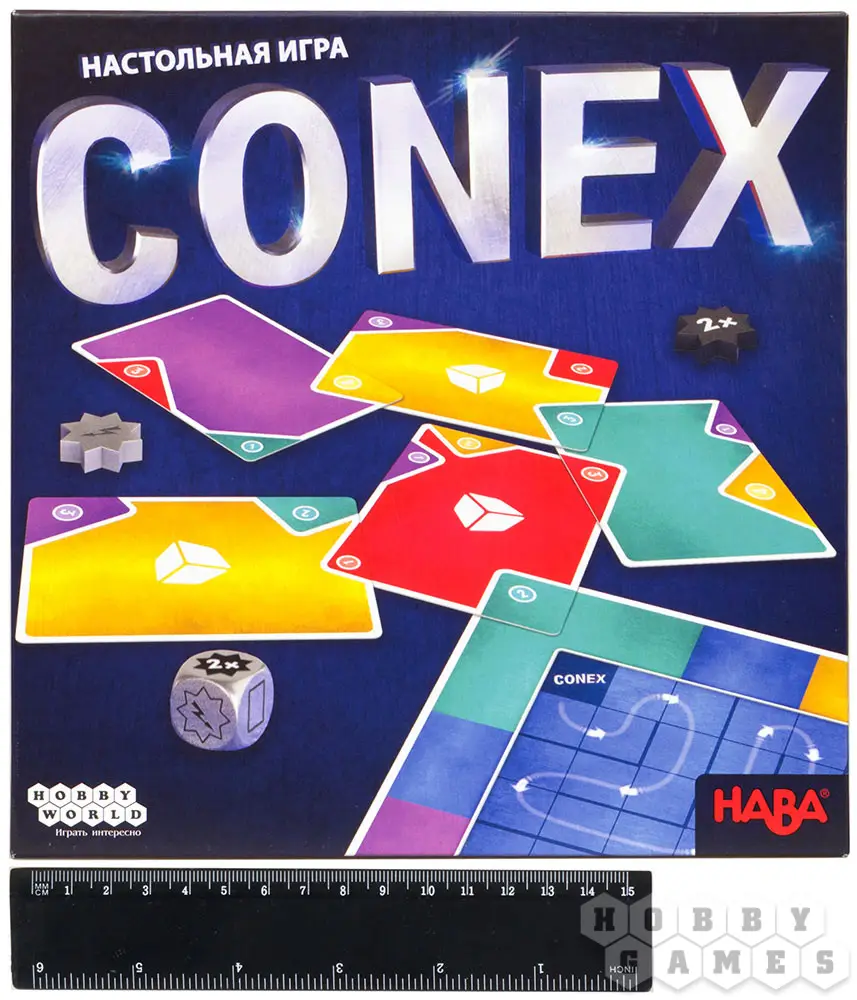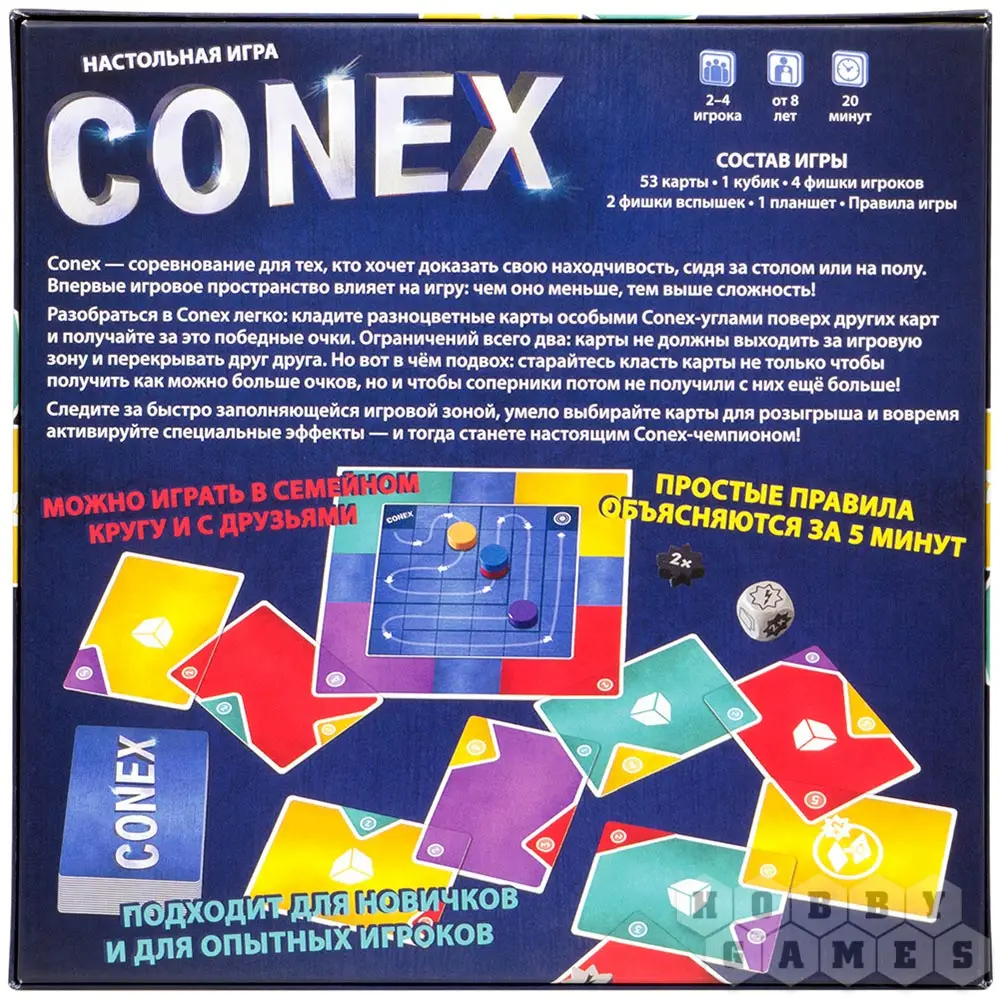 "Conex" – увлекательная абстрактная игра, которая отлично развивает логику, счёт, внимательность и пространственное мышление. При этом сама игра очень проста для понимания и освоения. Игровой процесс наглядный и полностью построен на разноцветных картах, на которых изображены Conex-углы в разном цвете и количестве. Игроки зарабатывают очки, выкладывая свои карты на стол по определённым правилам – перекрывая угол уже лежащей на столе карты с помощью своей карты с руки. При этом цвета углов обязательно должны совпадать.