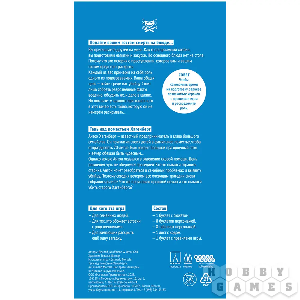 "Culinario Mortale: Тень над поместьем Хагенберг" – это кооперативное расследование с элементами ролевого отыгрыша, в котором у каждого игрока есть своя предыстория. Игра рассчитана на 6-8 игроков, включая ведущего.