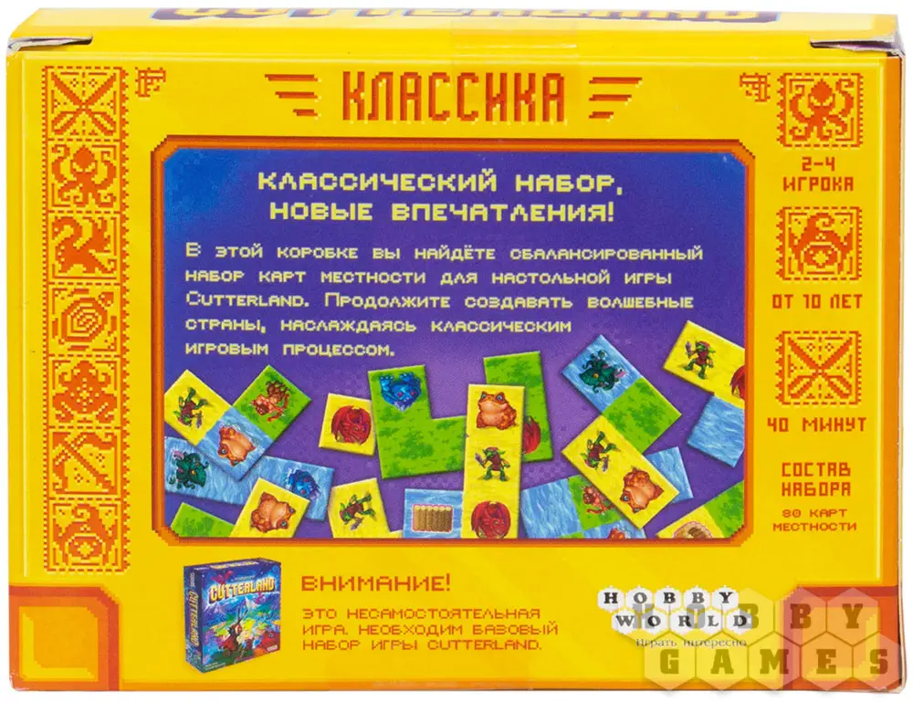 В коробке с дополнением "Cutterland. Классика", которая попала к вам в руки, вы найдёте комплект сразу из 80 новых карт местности. Благодаря им классический процесс создания волшебных земель никогда не закончится, а полюбившаяся игра будет снова и снова приносить вам приятные эмоции. Вновь приготовьте свои ножницы, чтобы были под рукой! Пришла пора создать ещё один фрагмент удивительной страны!