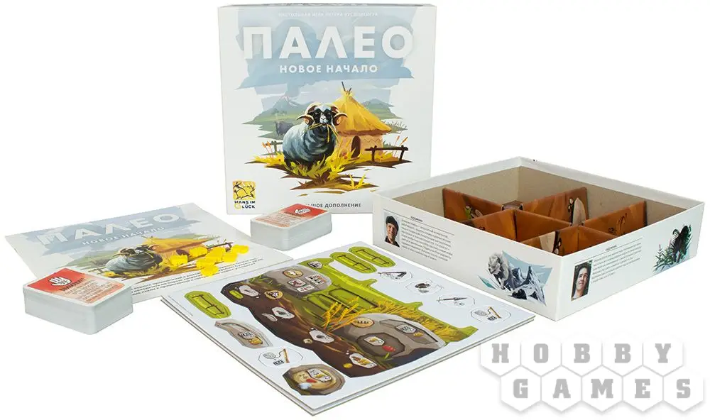 В дополнении "Палео: Новое начало" игрокам предстоит исследовать обширные территории: от глубин опасных джунглей до вершин ледяных гор. А ещё придётся пересечь границу мира снов, чтобы успокоить разозлившихся духов предков. Более 170 новых карт, среди которых: новые карты людей, снов и изобретений, 6 новых модулей-приключений, хижина, которая поможет противостоять капризам погоды, и планшет хозяйства, на котором располагаются загон для одомашненных животных и амбар для хранения ресурсов.