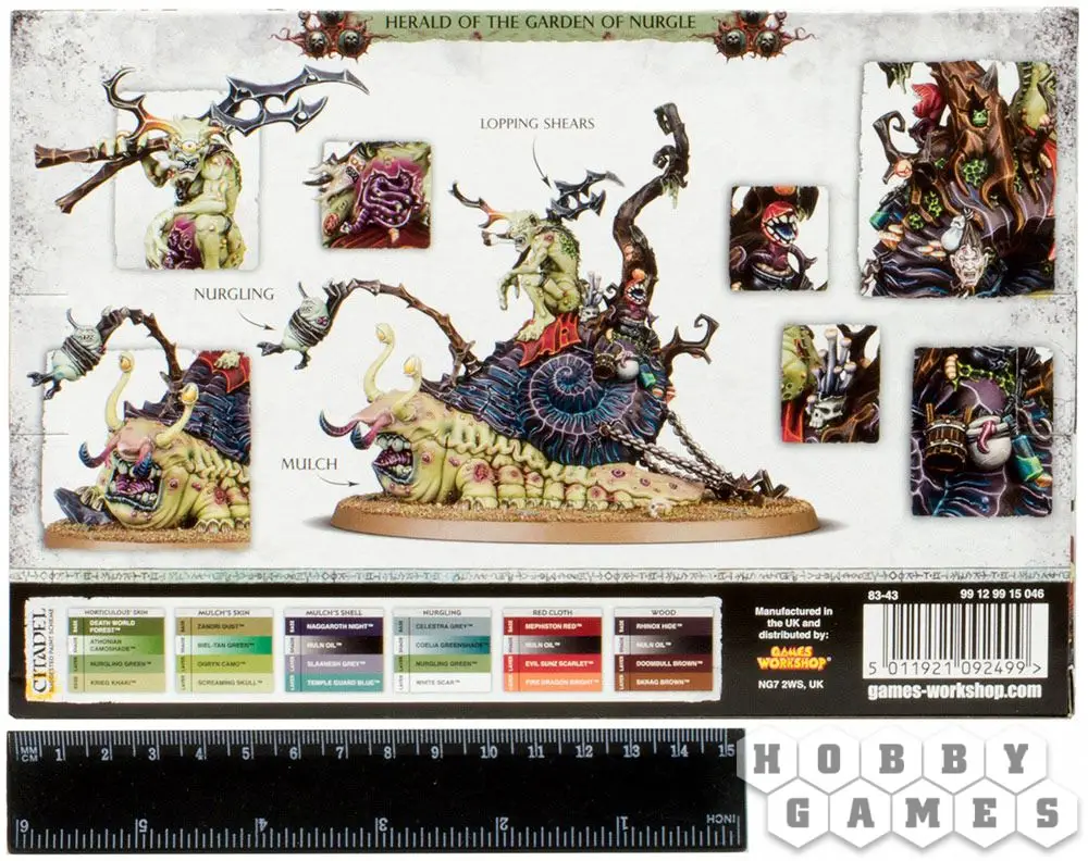 В этом многокомпонентном пластиковом наборе вы найдете детали, необходимые для сборки Хортикулюса Слимукса. В этой модели есть на что посмотреть: Хортикулюс – весьма зловещий малый, увешанный жутковатыми безделушками, тощий, но жилистый, с единственным чудовищным глазом во лбу. В руках он сжимает огромные садовые ножницы, предназначенные как для ухода за садом, так и для уничтожения врагов, и несет пучки растений, зелья, удобрения и грибы, с целью посадить их позже. Мульч (Mulch), ездовой слизень, тащит за собой Плуг (Gruntleplough), приделанный к его панцирю тремя цепями. Перед его мордой на прутике мотается связанный нурглинг, мотивируя Мульча тащиться дальше в надежде на вкусную трапезу – тем не менее, нурглингу, похоже, весело!