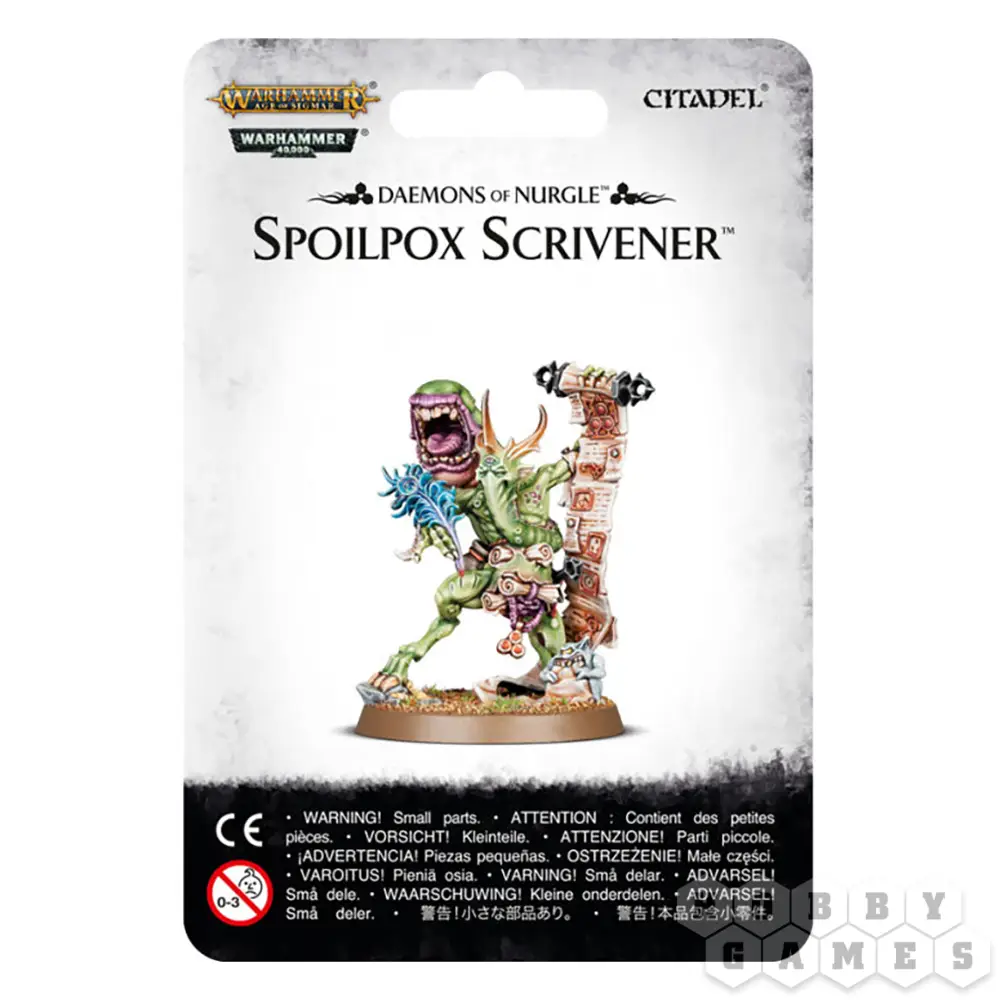 Этот многокомпонентный пластиковый набор содержит детали, необходимые для сборки модели Чумного Писаря, Глашатая Нургла (Spoilpox Scrivener, Herald of Nurgle). Первое что бросается в глаза – это свиток, покрытый записями и знаками Нургла, который Писарь держит в вытянутой руке, а также огромная раздутая утроба, которая обвивается вокруг всего тела и выглядывает над плечом ужасной пастью, источающей ругательства. Его тело выглядит скорее сильным и поджарым, нежели хилым, с длинными конечностями, оканчивающимися острыми когтями. Писарь имеет при себе запасные свитки, прикрепленные прямо к его плоти, свисая из разрывов в его животе, и подвязанные узлами из кишок. Подле Писаря располагается весьма дерзкий нурглинг, грызущий один из свитков.