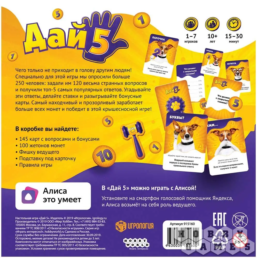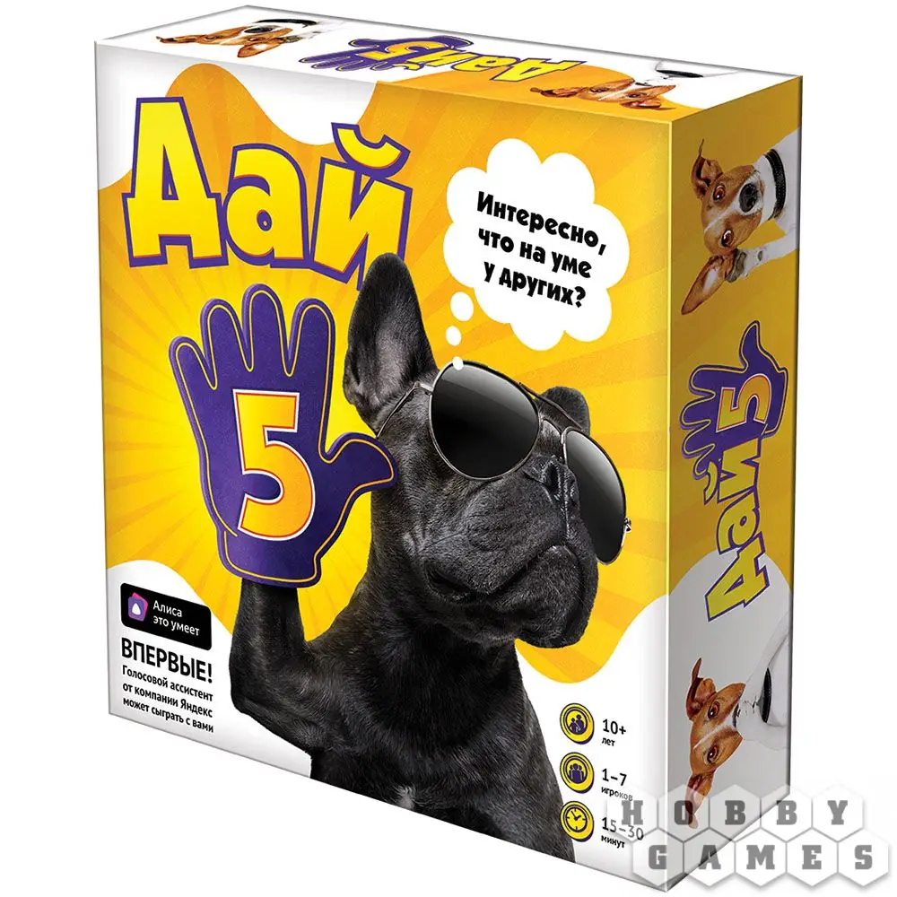 "Дай 5" – настольная викторина, в которой игрокам предстоит отгадывать наиболее популярные варианты ответов на различные интересные и местами странные вопросы. Игроки делают ставки, разыгрывают различные бонусные карты и получают монеты за правильные ответы на вопрос. Игра проста в освоении, чрезвычайно азартна и увлекательна, отлично подойдёт для игры с детьми. В неё можно играть большой компанией, поделившись на команды, можно играть одному или один на один по особым правилам.
