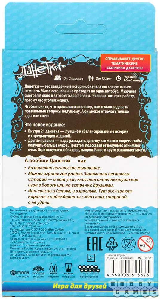 Зачем матросам спиливать верхушки мачт? Какие два абсолютно нейтральных по отношению друг к другу человека никогда не полетят в одном и том же самолёте? Почему на одной из остановок города никогда не останавливается ни один автобус? Игры из серии “Данетки” не даром уже давно стали популярным хитом, ведь любую, даже самую запутанную, историю здесь можно разгадать, задавая ведущему однозначные вопросы на “да” и “нет”. Приготовьтесь размять мозги и блеснуть познаниями в приятной компании!