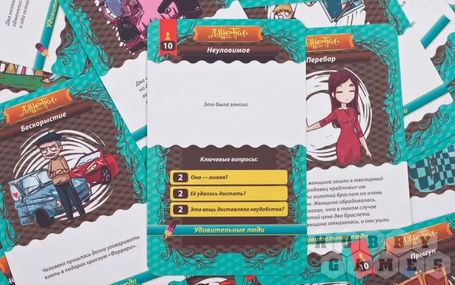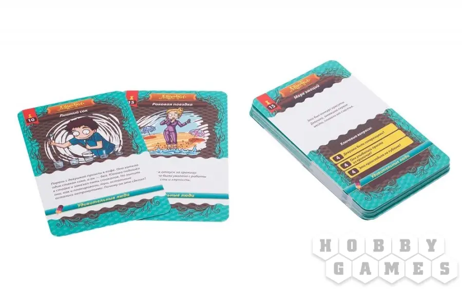 Отгадывающий смотрит одну сторону карточки с указанием части ситуации, ведущий - изучает обе, таким образом, он узнает всю историю. Дальше игрок, задавая вопросы, на которые можно ответить Да, Нет или Несущественно, пытается выяснить, что же произошло.