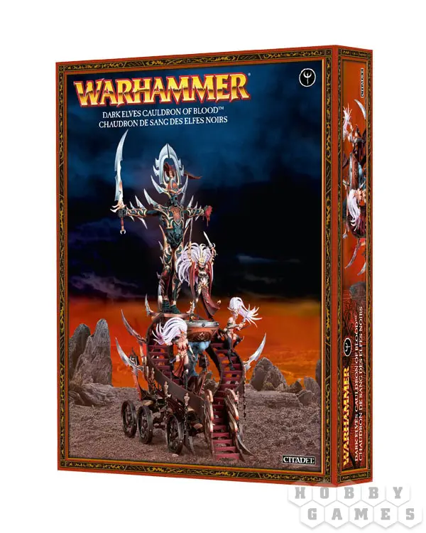 Котел Крови – это алтарь Кхэйну, Кроваворукому Богу. Управляемый Ведьмой Смерти и двумя ее служками, Котел сочится темными энергиями, вводя ближайших Темных Эльфов в кровожадный экстаз. Рядом с котлом установлена огромная статуя Кхейна. Две ведьмы, вооруженные парами кинжалов, направляют колесницу. У ног Кроваворукого Бога можно установить как миниатюру Ведьмы Смерти, вооруженную кинжалом и кубком, так и Королеву Ведьм Хеллеброн, вооруженную Мечом Смерти и Проклятым Клинком. Какую бы из старших ведьм Вы не выбрали, в наборе всегда есть дополнительная подставка пехоты для оставшейся.