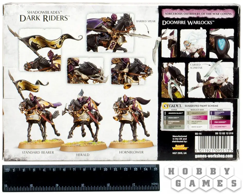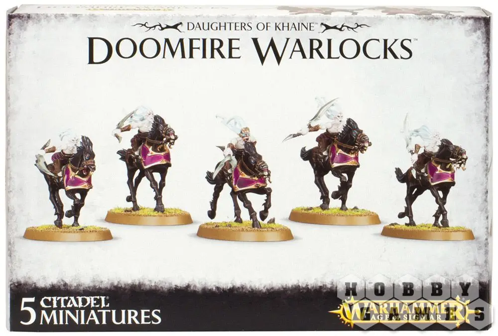 Этот многокомпонентный набор содержит детали, необходимые для сборки пяти моделей Чернокнижников (Doomfire Warlocks). Изможденные и увядшие, почти иссохшие, эти страдающие в агонии создания стремительно атакуют любого, кто окинет их взглядом. Их лица искажены насмешливыми гримасами ненависти. Чернокнижники вооружаются проклятыми скимитарами или роковыми луками – этим оружием они владеют в совершенстве, сражаясь верхом на своих темных скакунах. Эти огромные бронированные боевые кони выглядят весьма зловеще, с их острыми черными шпорами на ногах, скалящимися зубами и колдовскими рунами на боках. Лидера отряда, Магистра Чернокнижников, можно узнать по сдвоенному скимитару и маске.