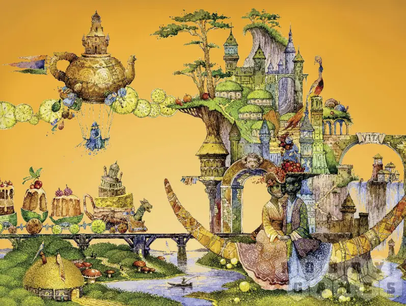 Высоко на горе стоит сказочный город, а по железной дороге к нему движутся составы кексов и тортов. В воздухе парит диковинный воздушный шар или летающий магический чайник, кто знает? В этой идиллии сидят прелестные котики, наслаждаясь предзакатным солнцем.