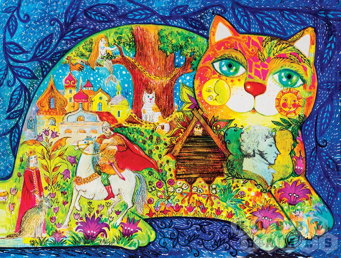 Герои произведений Пушкина оживают в деталях пазла и создают атмосферу сказки: кот ученый, русалка, старик и золотая рыбка, избушка на курьих ножках, Баба-Яга, и другие...