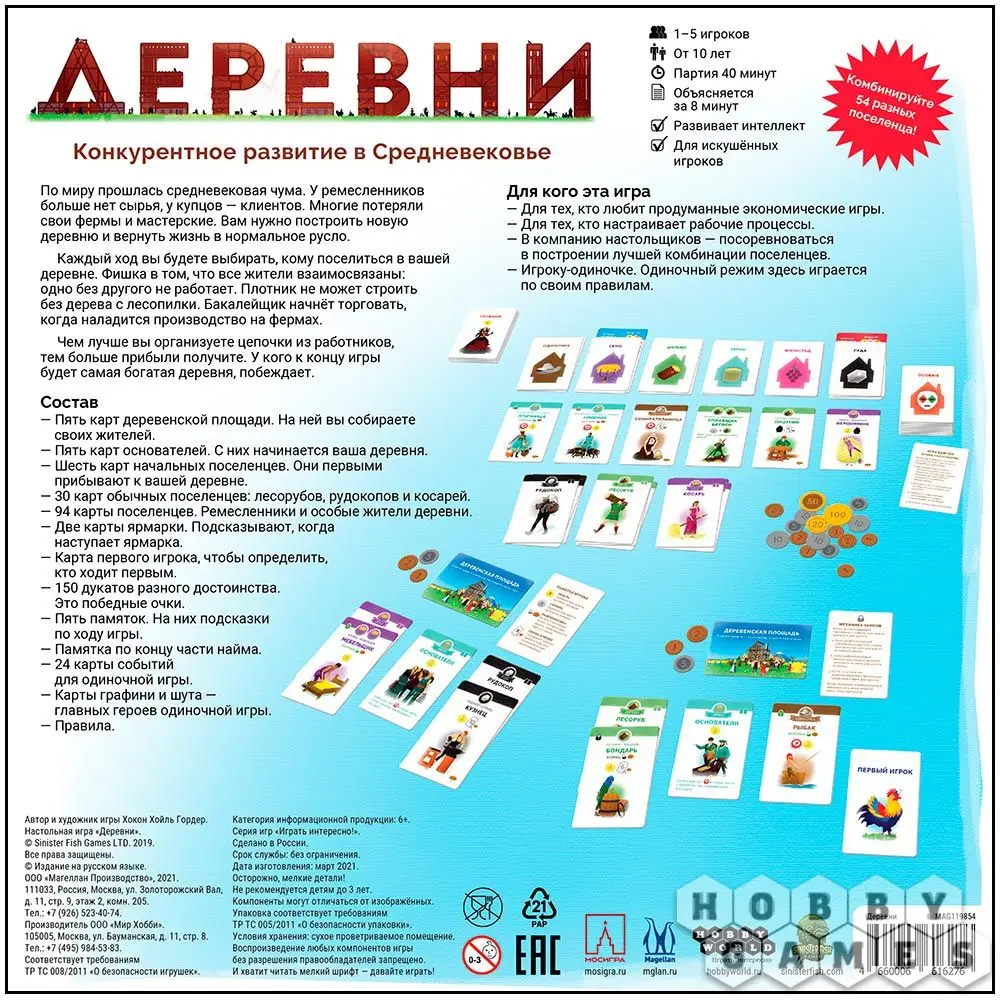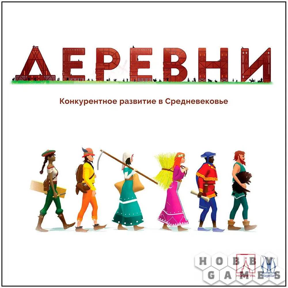 "Деревни" – это карточная экономическая стратегия, в которой игрокам предстоит заселять выкошенные чумой деревушки. Вся Европа пришла в запустение после последней эпидемии Чёрной Смерти. Ремесленники не могут выполнять заказов, ведь купцы не привозят сырьё, а купцы не видят смысла везти его туда, где этих ремесленников недостаточно – ведь есть шанс, что никто ничего не купит. Потерявшие работу умельцы скитаются по земле в поисках заработка хотя бы на кусок хлеба – и вам нужно выбрать самых достойных из них, чтобы заселить и застроить своё поселение. Главное помнить, что все профессии связаны с какими-то другими, например, нет смысла в плотнике, если никто не добывает древесину, а в бакалейщике – если фермы не приносят хороший урожай. Ваша задача – собрать самую эффективную цепочку производства и сделать свою деревню самой зажиточной – что и приведёт вас к победе! Играть в "Деревни" можно как соревнуясь с друзьями (от 2 до 5 игроков), так и в специальном соло-режиме, в котором поселенцам придётся преодолевать козни злой графини, которая старается укрепить свои политические позиции.