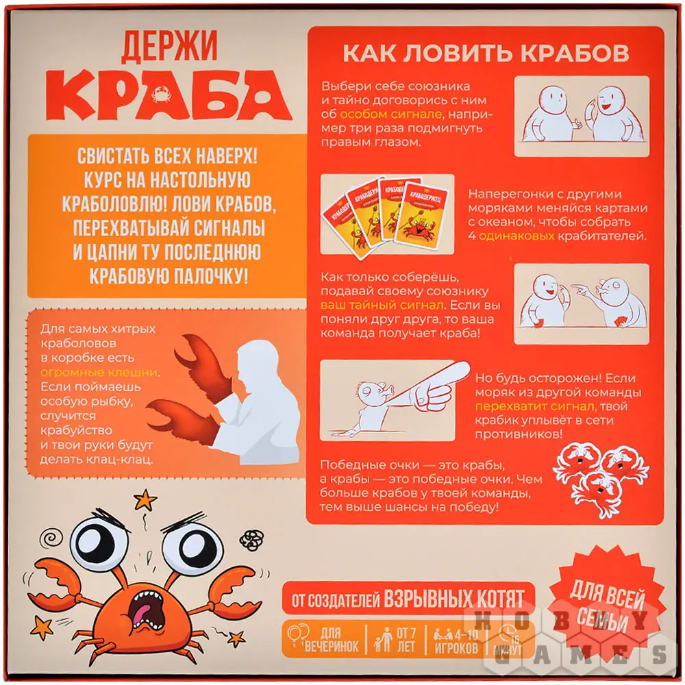 "Держи краба" – игра от создателей знаменитой серии "Взрывные котята". Вы будете играть за моряков, которые ловят крабов. Вот только вас таких охотников много, а крабов не бесконечное множество. Поэтому вы разделитесь на команды и будете действовать сообща. А по пути не забудьте не только обхитрить своих соперников, но и лишить их всех выловленных ими крабов.