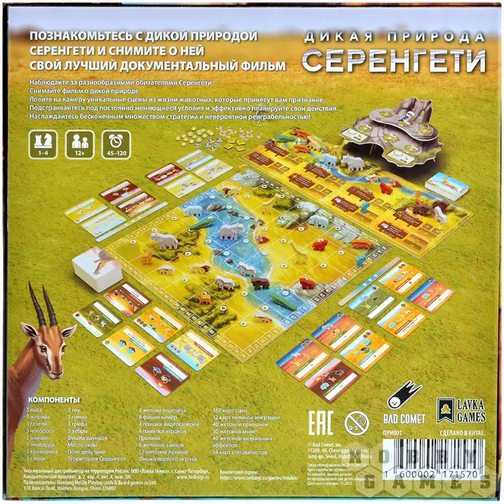 В настольной игре "Дикая природа Серенгети" вам предстоит стать режиссёром фильма о природе заповедника. Цель игры – заработать больше других очков престижа, снимая удачные сцены с животными. У вас будут карты этих самых сцен с положениями животных, при которых эта она может быть снята. В свой ход можно выставить на игровое поле новое животное, или переместить уже находящееся на нём. Однако добиться идеального кадра непросто: некоторые животные опасаются других, а какие-то и вовсе предпочитают конкретные места заповедника. Более того, каждый раунд будет происходить миграция животных, которая изменит их положение или вовсе уберёт с игрового поля. Старайтесь учитывать все факты и принимайте во внимание законы дикой природы, чтобы выставить удачный ракурс, снять как можно больше сцен и добиться признание мирового сообщества!