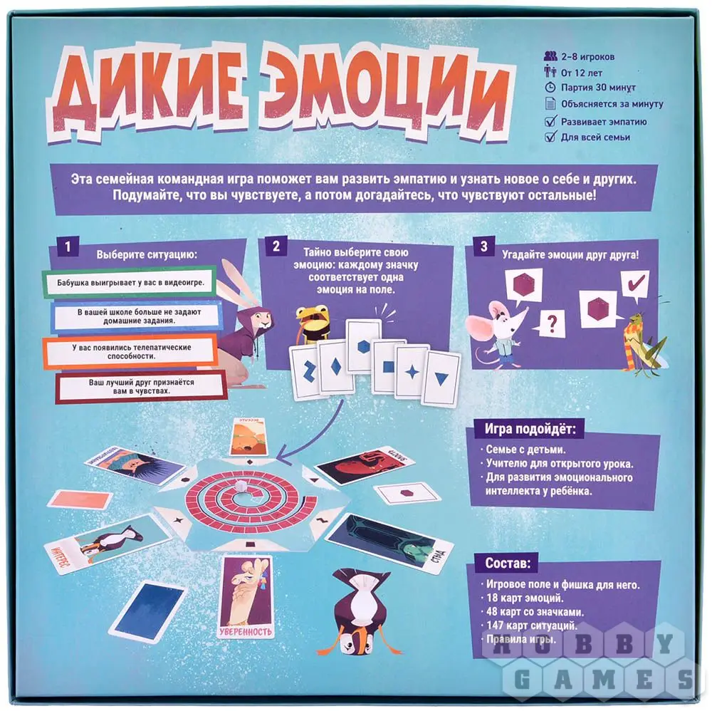 Что вы будете чувствовать, если перестанете стареть? Радость? Страх? Недоверие? А что почувствовали бы ваши друзья? В "Диких эмоциях" вы сможете раскрыться для других игроков и самостоятельно проявить к ним эмпатию. Понимать друг друга – важный навык, без которого очень сложно существовать в обществе. Эта игра про эмоциональный интеллект поможет попрактиковаться в понимании чужих чувств и выражении своих собственных.