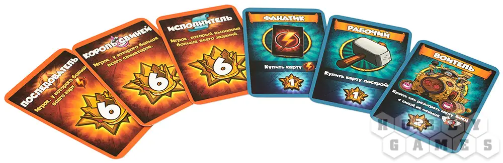 На начало игры каждый игрок получает по два задания и на протяжении игры стремится их выполнить, чтобы получить дополнительные награды.