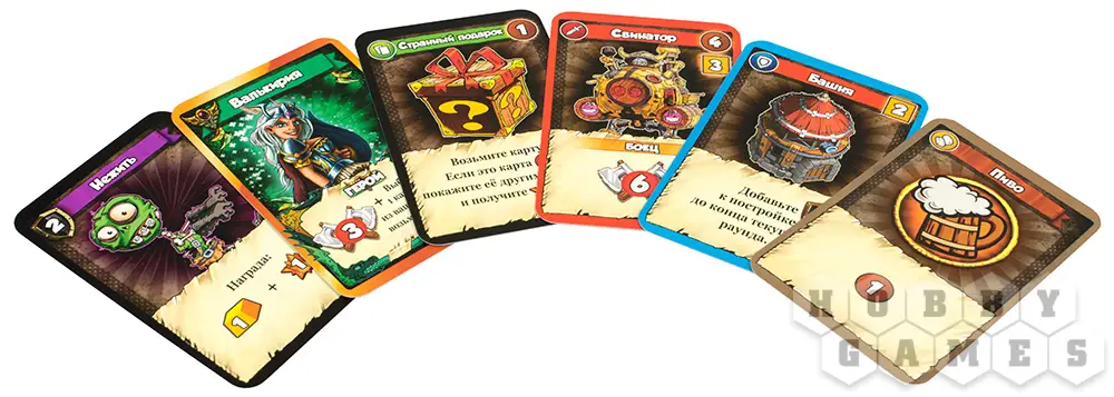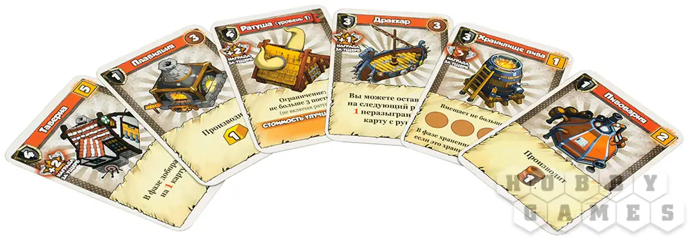 Фаза добора – игроки берут по пять карт из своих колод. Каждая таверна позволяет брать на одну карту больше, а драккар позволяет оставить карту на следующий раунд