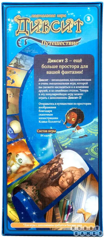 "Диксит 3. Путешествие" – это дополнение к настольной игре "Диксит" и "Диксит Одиссея". Эта колода привносит в эту удивительную игры свежие образы и ассоциации, делая процесс игры еще разнообразнее и интереснее. В этой колоде представлены новые карты в количестве 81 штуки, на которых изображены фантастические и сюрреалистические произведения художественного искусства. В новой версии дополнения, коробка стала меньше и удобнее для путешествий.