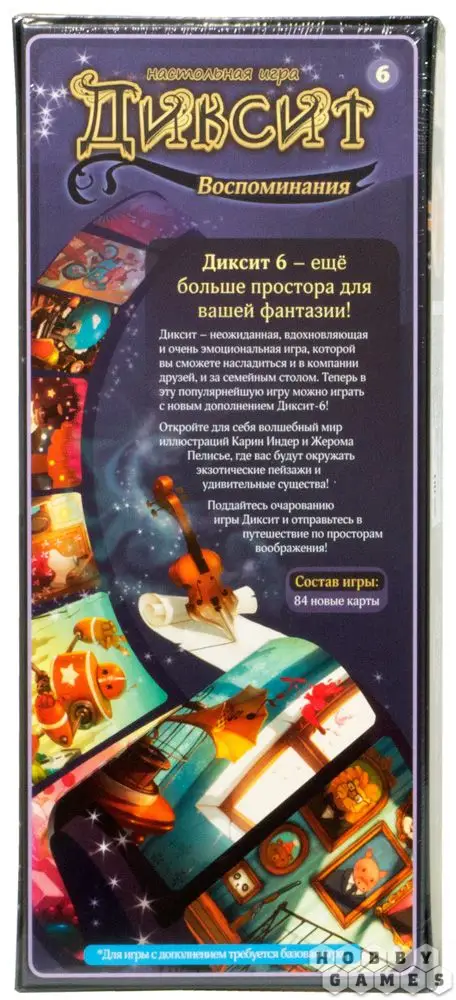 "Диксит 6. Воспоминания" – это дополнение к настольной игре "Диксит" и "Диксит Одиссея". Эта колода привносит в эту удивительную игры свежие образы и ассоциации, делая процесс игры еще разнообразнее и интереснее. В этой колоде представлены новые карты в количестве 84 штук, на которых изображены фантастические и сюрреалистические произведения художественного искусства.